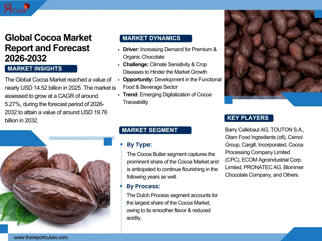 The Global Cocoa Market reached a value of nearly USD 14.52 billion in 2025. The market is assessed to grow at a CAGR of around 5.27%, during the forecast period of 2026-2032 to attain a value of around USD 19.76 billion in 2032.