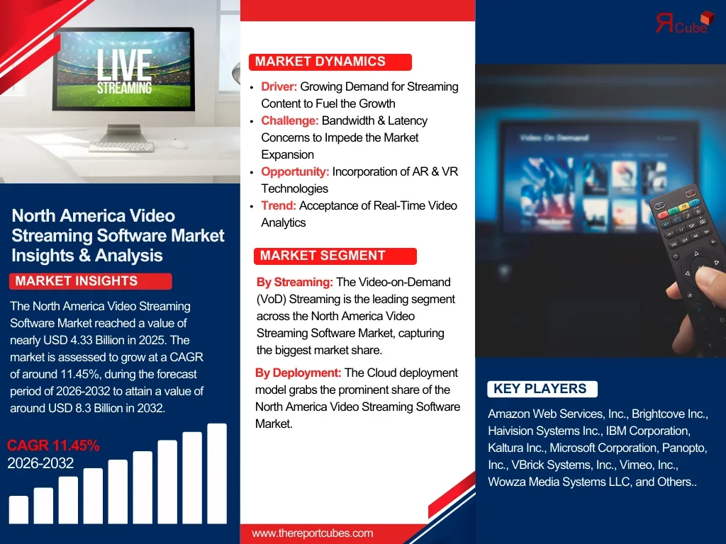 The North America Video Streaming Software Market reached a value of nearly USD 4.33 Billion in 2025. The market is assessed to grow at a CAGR of around 11.45%, during the forecast period of 2026-2032 to attain a value of around USD 8.3 Billion in 2032.