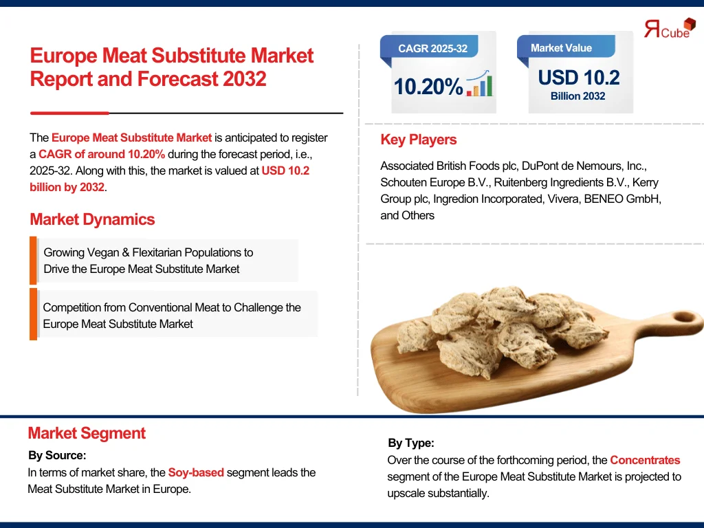 The Europe Meat Substitute Market is anticipated to register a CAGR of around 10.20% during the forecast period, 2025-32.