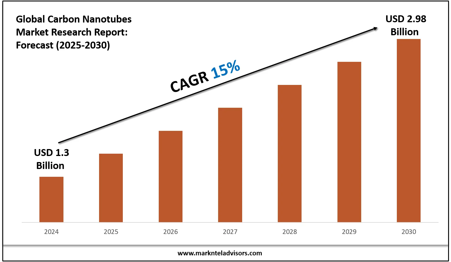 A: The carbon nanotubes market is expected to reach approximately USD 2.98 billion by 2030.
