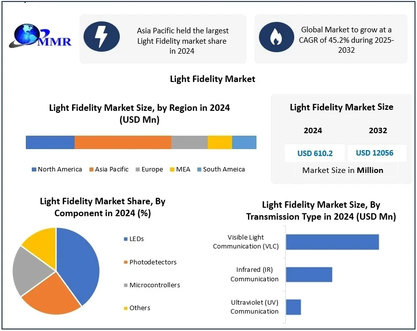 The Light Fidelity Market was valued at USD 610.2 Mn in 2024, and total global Light Fidelity Market revenue is expected to grow at a CAGR of 45.2% and reach nearly USD 12056 Mn from 2025 to 2032.