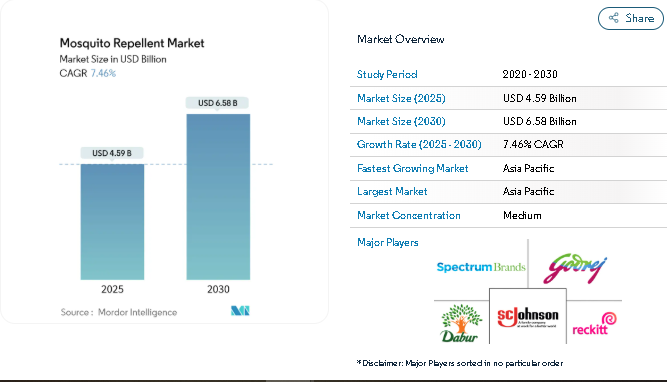 The global mosquito repellent market is estimated at USD 4.59 billion in 2025 and expected to reach USD 6.58 billion by 2030, registering a robust CAGR of 7.46%. This growth is driven by rising awareness of mosquito-borne diseases, expanding urban populations, and a growing consumer shift toward natural and eco-friendly repellents.