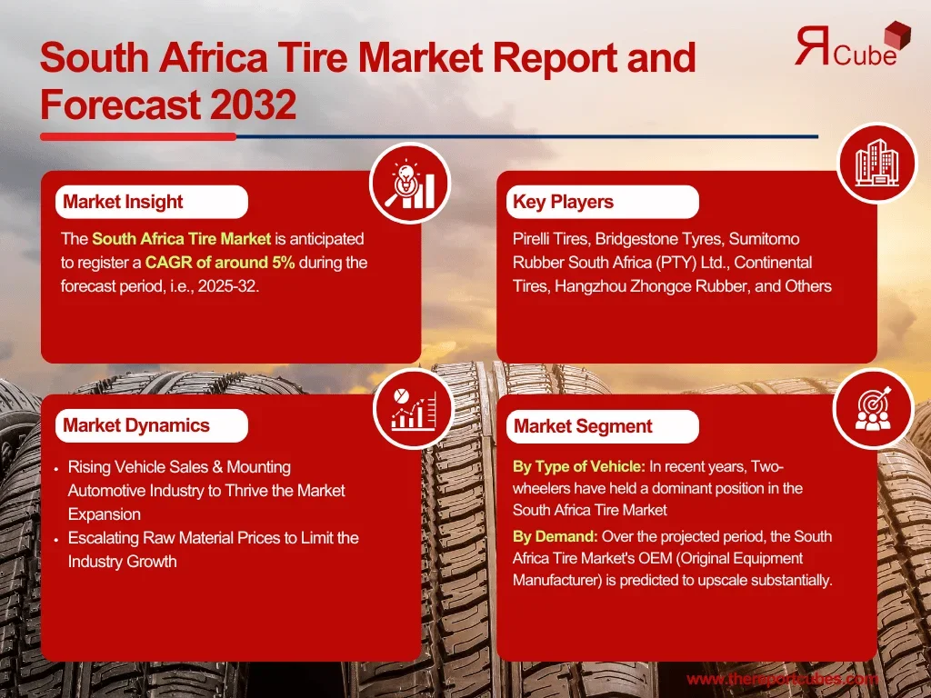 The South Africa Tire Market is anticipated to register a CAGR of around 5% during the forecast period, i.e., 2025-32.