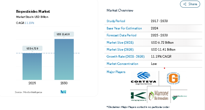 The global biopesticides market is poised for significant growth, with an estimated value of USD 6.72 billion in 2025 projected to reach USD 11.41 billion by 2030, registering a strong CAGR of 11.19% during the forecast period (2025–2030). The growing emphasis on sustainable agriculture, organic food production, and environmentally safe pest control is driving large-scale adoption of biopesticides across global farming systems.