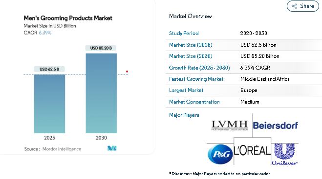 The global men grooming products market is estimated at USD 62.50 billion in 2025 and is projected to reach USD 85.20 billion by 2030, registering a CAGR of 6.39% during the forecast period (2025–2030). This growth trajectory is propelled by changing perceptions of masculinity, with men increasingly embracing skincare, self-care, and personal style as integral aspects of their identity.