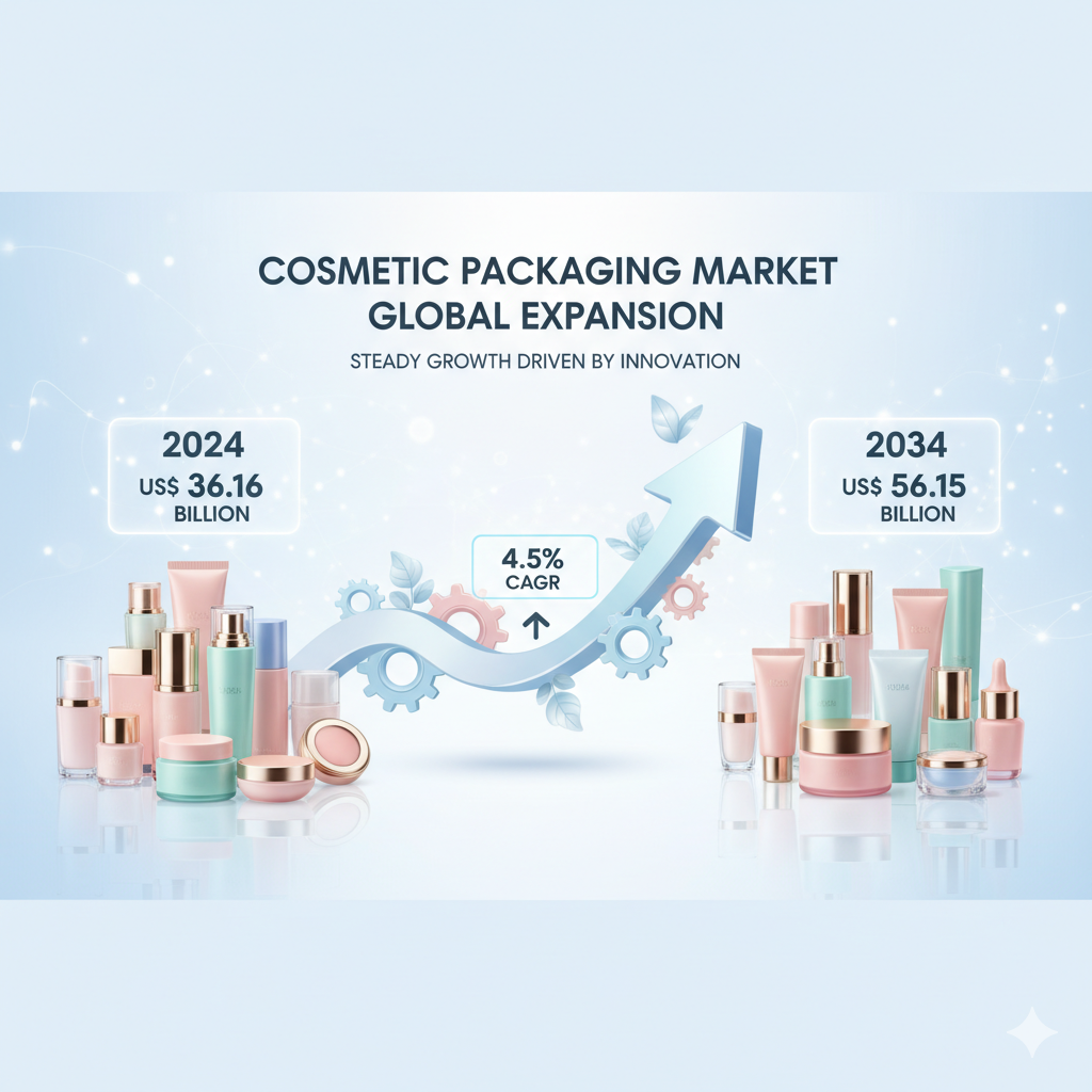 Cosmetic packaging market forecast is on a strong upward trajectory. The market size stands at US$ 36.16 billion in 2024 and is projected to reach US$ 56.15 billion by 2034, growing at a CAGR of 4.5% from 2025 to 2034.