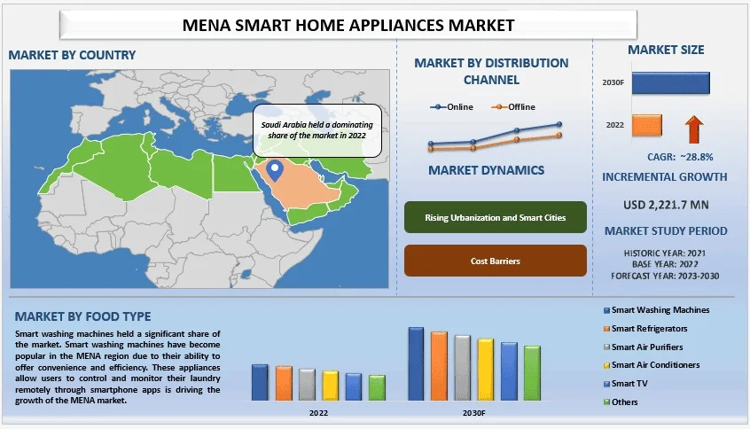 According to the UnivDatos, the rising popularity of video games and favorable government policies will drive the global scenario of the smart home appliances market and as per their “MENA Smart Home Appliances Market” report, the market was valued at USD 2,221.7 million in 2022, growing at a CAGR of 28.8% during the forecast period from 2023 - 2030 to reach USD billion by 2030.