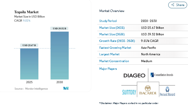 The global tequila market is on a strong upward trajectory, expected to increase from USD 25.67 billion in 2025 to USD 39.52 billion by 2030, registering an impressive CAGR of 9.01% during the forecast period (2025–2030). According to the latest Tequila Market Report by Mordor Intelligence, tequila has emerged as one of the fastest-growing segments within the global alcoholic beverage industry.