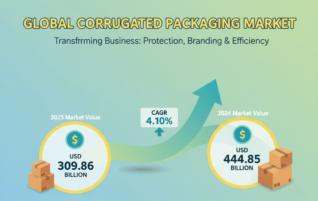 The global corrugated packaging market is projected to experience significant growth from USD 309.86 billion in 2025 to USD 444.85 billion by 2034, at a compound annual growth rate (CAGR) of 4.10%. This expansion is primarily driven by the growth of the e-commerce sector, where corrugated packaging is essential for product shipping and protection. Moreover, the increasing demand for eco-friendly and sustainable packaging alternatives, along with customized packaging solutions designed to optimize logistics and reduce waste, further fuels this market.