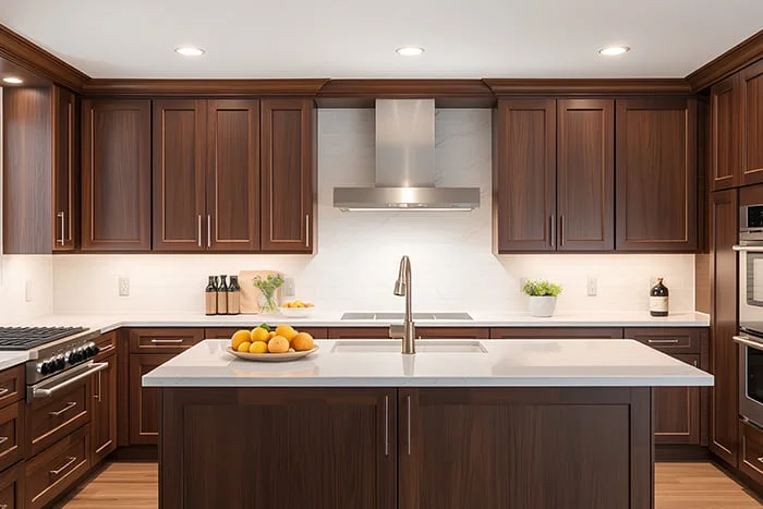 Every few months, use a wood polish to keep that smooth, rich texture. For modern dark brown kitchen cabinets, a gentle cleaner works best to preserve the color depth.