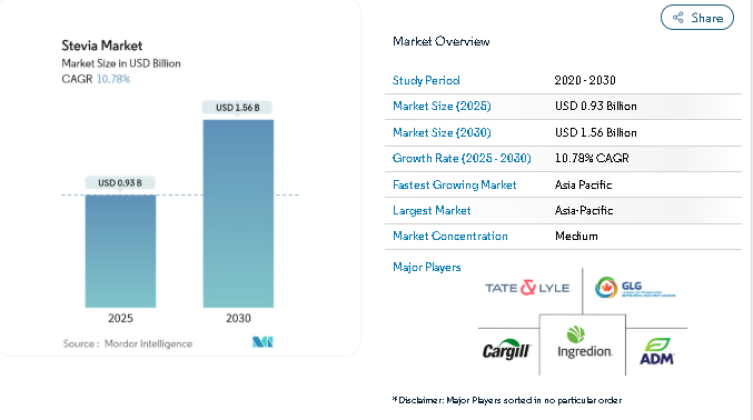 The global stevia market is on a strong upward trajectory, projected to grow from USD 0.93 billion in 2025 to USD 1.56 billion by 2030, at an impressive CAGR of 10.78%. This expansion underscores the accelerating shift toward natural, plant-based, and zero-calorie sweeteners as consumers worldwide actively reduce sugar consumption.