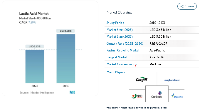 According to the latest Global Lactic Acid Market Report by Mordor Intelligence, the global lactic acid market size is expected to grow from USD 3.63 billion in 2025 to USD 5.30 billion by 2030, expanding at a CAGR of 7.89% during the forecast period (2025–2030).