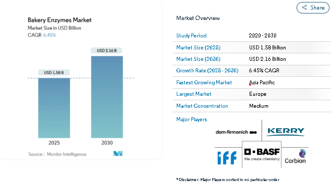 According to the latest Bakery Enzymes Market Report by Mordor Intelligence, the global bakery enzymes market size is projected to increase from USD 1.58 billion in 2025 to USD 2.16 billion by 2030, registering a steady CAGR of 6.45% during the forecast period. This growth reflects the rising global shift toward clean-label, sustainable, and functional bakery products as consumers seek transparency and natural ingredient profiles.
