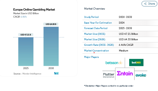 According to the latest Europe Online Gambling Market Report published by Mordor Intelligence, the Europe online gambling market size is estimated at USD 47.21 billion in 2025 and projected to reach USD 64.55 billion by 2030, growing at a CAGR of 6.46% during 2025–2030.