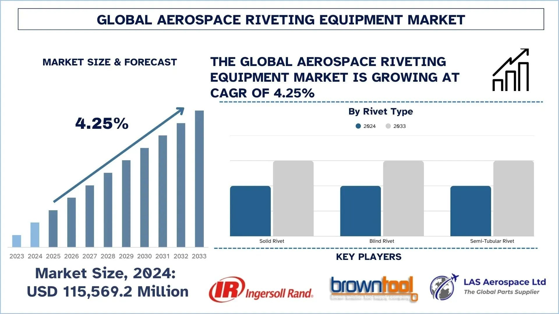 According to UnivDatos analysis, the increasing technological advancement, coupled with continuous mergers and acquisitions, are the major factors driving the growth of the Aerospace riveting equipment market. As per their “Aerospace Riveting Equipment Market” report, the global market was valued at USD 115,569.2 million in 2024, growing at a CAGR of about 4.25% during the forecast period from 2025 - 2033 to reach USD million by 2033.