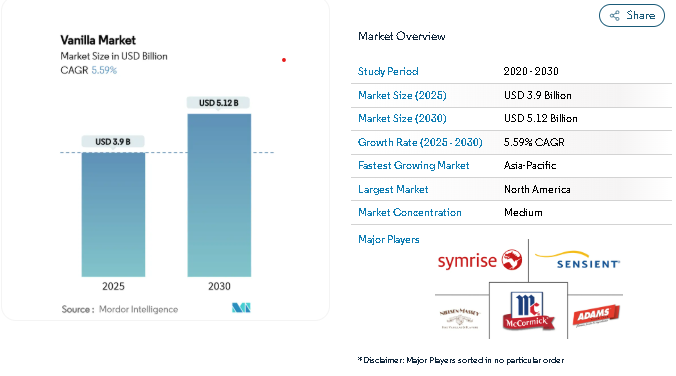 According to the latest Global Vanilla Market Report published by Mordor Intelligence, the vanilla market size is projected to increase from USD 3.90 billion in 2025 to USD 5.12 billion by 2030, growing at a CAGR of 5.59% during the forecast period (2025–2030). The global vanilla industry is witnessing sustained momentum, powered by surging demand across food, beverage, personal care, and nutraceutical applications.