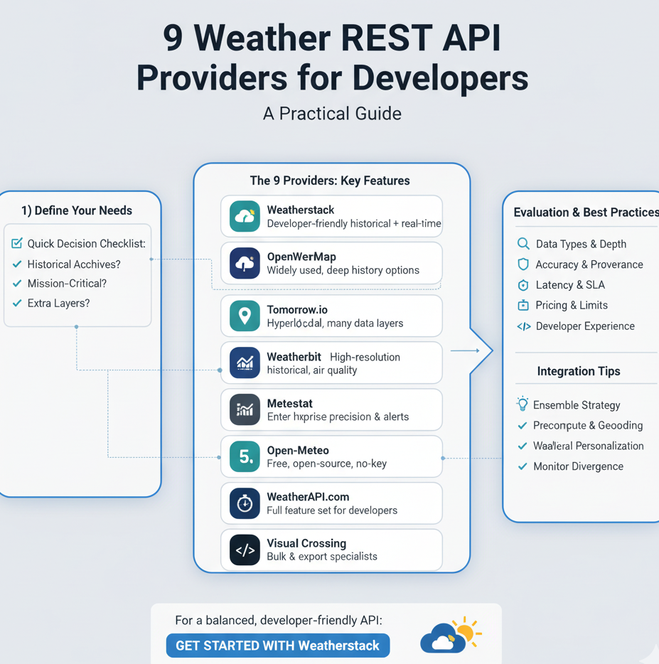 Choosing the right weather REST API is more than picking the cheapest or most-famous provider. It’s about matching data types (real-time, forecast, historical), granularity, reliability, pricing, and developer experience to the needs of your app. Below is a developer-focused guide to nine top weather REST APIs, how they differ, smart integration tips, FAQs, and a CTA for Weatherstack if you want a balanced, developer-friendly option.
