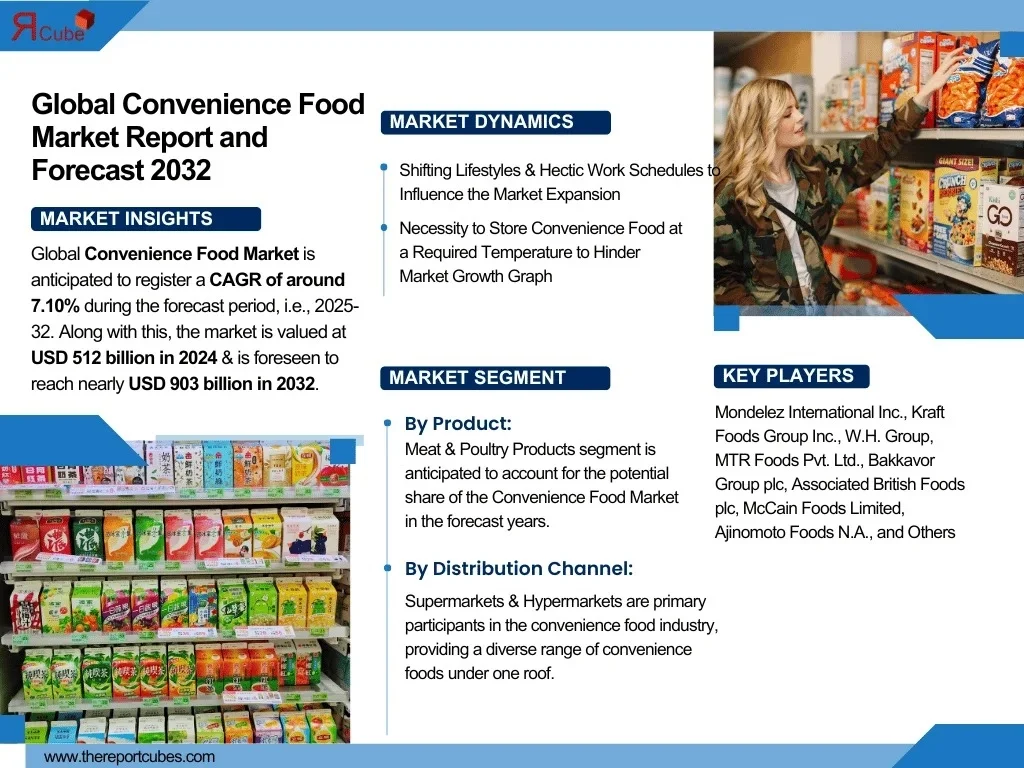 The Global Convenience Food Market is anticipated to register a CAGR of around 7.10% during the forecast period, i.e., 2025-32. Along with this, the market is valued at USD 512 billion in 2024 & is foreseen to reach nearly USD 903 billion in 2032. The changing lifestyle, hectic schedules, augmented urbanization, on-the-go mentality, and larger discretionary income ranges have all contributed to the industry's sturdy expansion. Technical progressions in food preservation & packaging have assisted to expand the convenience food business. ‘