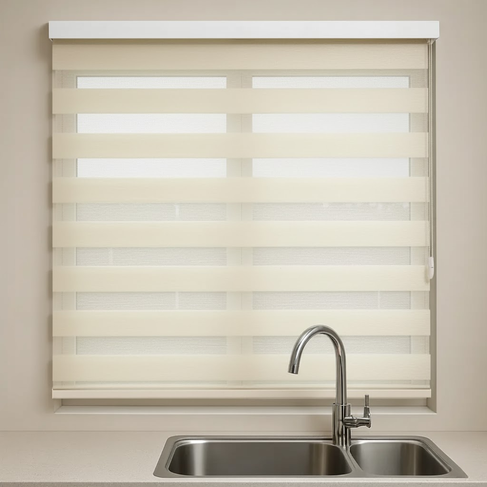 Korean Blinds are crafted from two layers of fabric — one sheer and one opaque — that alternate in horizontal stripes. When adjusted, the layers overlap in different ways, letting users control how much light enters the room. This dual-layer mechanism allows for a smooth transition between sheer and solid coverage without lifting the entire blind.