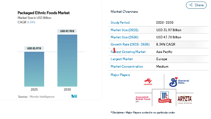 According to the latest Ethnic Foods Market Industry Report by Mordor Intelligence, the global ethnic foods market is valued at USD 31.97 billion in 2025 and is projected to reach USD 47.7 billion by 2030, growing at a CAGR of 8.34%. This growth reflects the strong global appetite for authentic culinary experiences, driven by increasing multicultural populations, a growing affinity for international cuisines, and the expansion of ethnic food availability across retail formats.