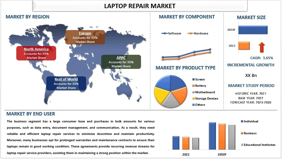 According to the UnivDatos, the surge in the adoption of wearable devices drives the scenario of laptop repair worldwide in the “Laptop Repair Market” report, the market was valued at USD Billion in 2022 and expected to grow at a CAGR of 3.65% during the forecast period from 2023 - 2030 to reach to billion by 2030.