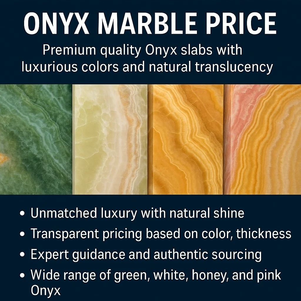 • Transparent onyx pricing helps customers choose the perfect slab based on color rarity, origin, thickness, polish quality, and natural stone uniqueness.