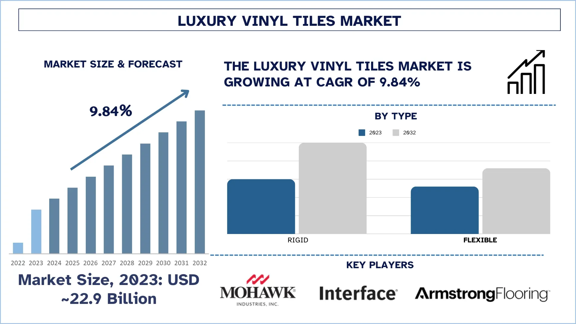 According to the UnivDatos analysis, rapid growth in the construction sector, rising demand for low-maintenance flooring options, the cost-effectiveness and ease of installation drive the market. As per their “Luxury Vinyl Tiles Market” report, the global market was valued at USD 22.9 Billion in 2023, growing at a CAGR of about 9.84% during the forecast period from 2024 – 2032.