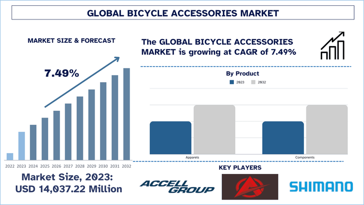 According to the UnivDatos Analysis, as per their “Bicycle Accessories Market” report, the global market was valued at USD 14,037.22 million in 2023, growing at a CAGR of about 7.49% during the forecast period from 2024-2032.
