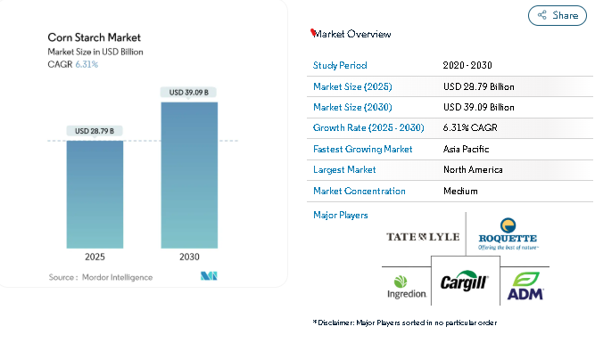 The global corn starch market is witnessing sustained momentum as industries increasingly adopt starch-based solutions across food, pharmaceuticals, personal care, and industrial manufacturing. According to recent market assessments, the corn starch market size is valued at USD 28.79 billion in 2025 and is projected to reach USD 39.09 billion by 2030, reflecting rising use cases in clean-label food products, natural excipients, and eco-friendly industrial applications.