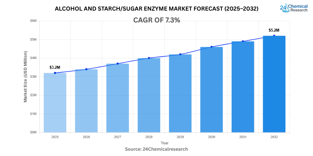 Global Alcohol and Starch/Sugar Enzyme market size was valued at USD 3.2 billion in 2024. The market is projected to grow from USD 3.5 billion in 2025 to USD 6.1 billion by 2032, exhibiting a CAGR of 7.3% during the forecast period.
