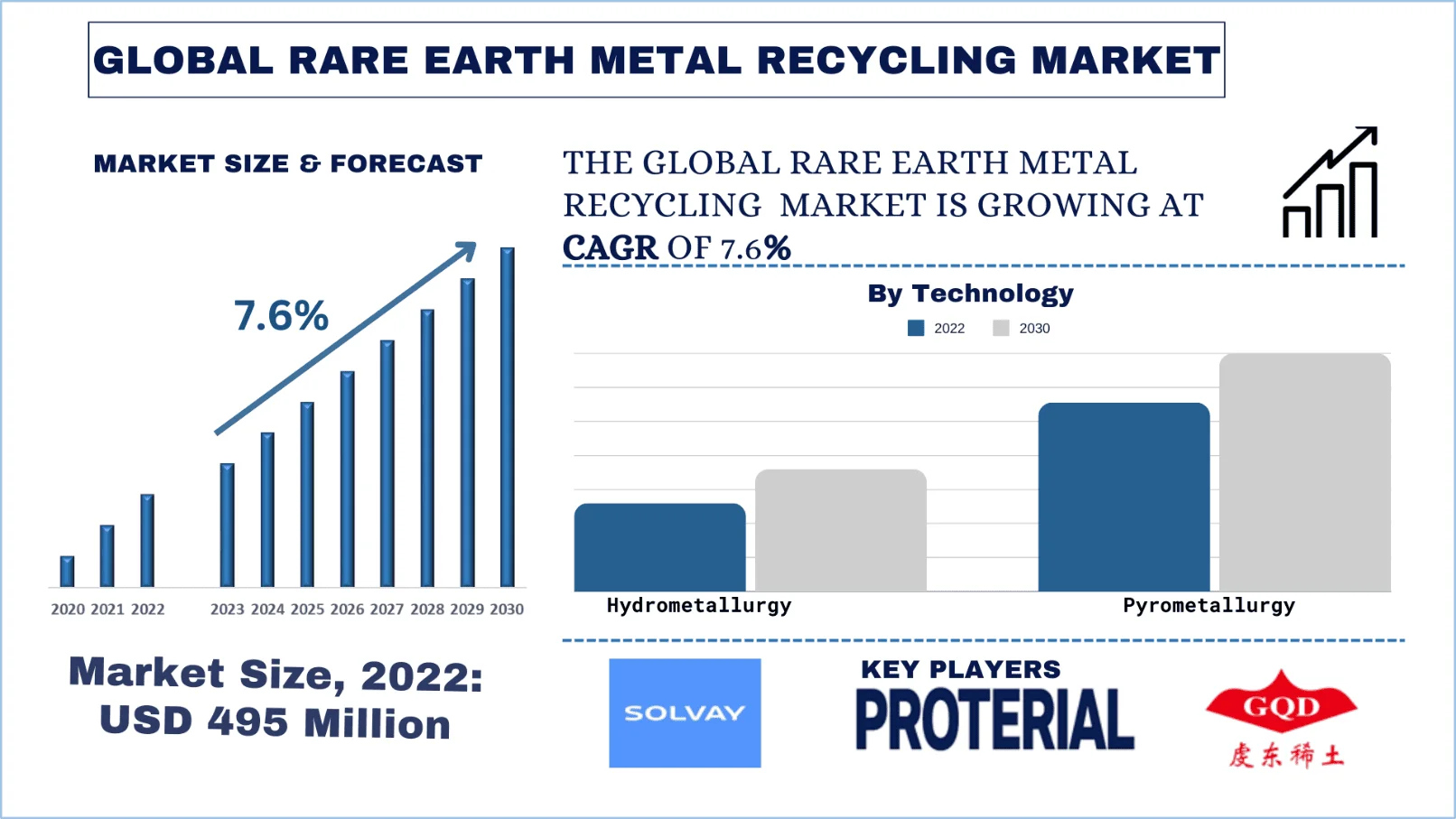 According to the UnivDatos, the increasing concerns about climate change and energy security, the increasing demand for renewable energy sources transform the global scenario of rare earth metal recycling and as per their “Rare Earth Metal Recycling Market” report, the global Market was valued at USD 495 million in 2022, growing at CAGR of 7.6 % during the forecast period from 2023 - 2030 to reach USD billion by 2030.