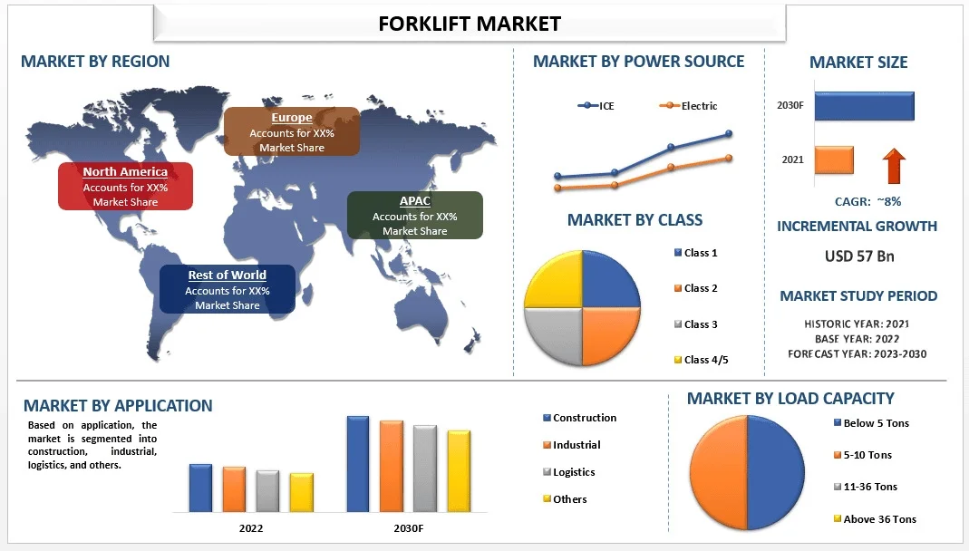 According to UnivDatos, the Global Forklift Market was valued at USD 57 billion in 2022. With ongoing technological advancements and increasing demand from logistics and construction, the market is projected to grow at a compound annual growth rate (CAGR) of 8% through 2030. By the end of the forecast period, the market is expected to reach significantly higher valuations as companies worldwide continue modernizing their material-handling capabilities.
