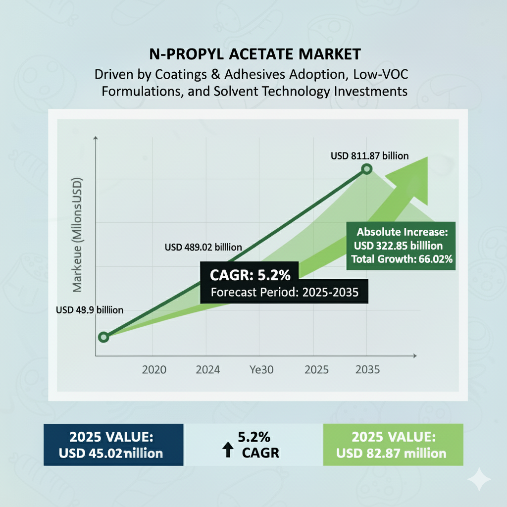 The global N-propyl acetate market is poised for steady expansion through 2035, fueled by rising demand for eco-friendly solvents, bio-based innovations, and regulatory pushes for low-VOC formulations. According to Future Market Insights (FMI), the market is valued at USD 489.02 million in 2025 and is projected to reach USD 811.87 million by 2035, expanding at a compound annual growth rate (CAGR) of 5.2%.