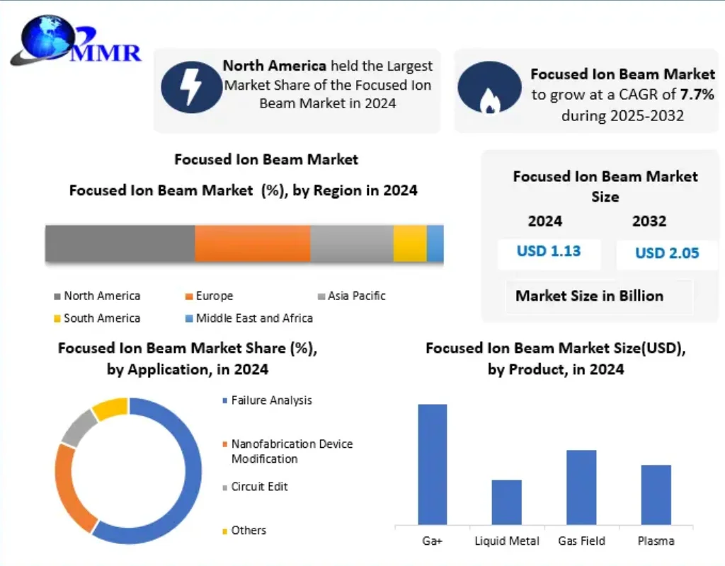 The Global Focused Ion Beam Market size was valued at USD 1.13 Bn in 2024, and the total Focused Ion Beam Market revenue is expected to grow by 7.7% from 2025 to 2032, reaching nearly USD 2.05 Bn.