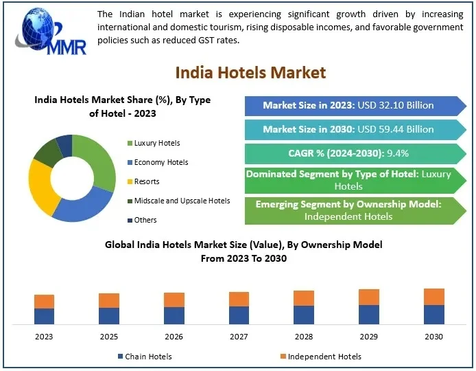 Maximize Market Research, a prominent business consulting firm, has published an in-depth report on the India Hotels Market The study delivers key business insights such as demand trends, pricing analysis, and a detailed review of the competitive landscape. It thoroughly assesses the current market conditions and includes forecasts for the India Hotels Market through the year 2030.
