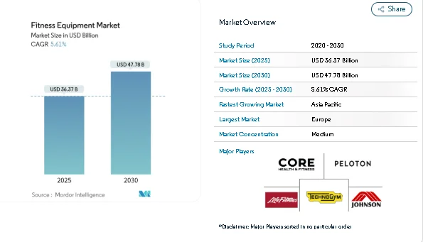 The global fitness equipment market is entering a steady growth phase as consumers shift toward healthier routines, structured exercise programs, and data-supported training experiences. According to current assessments, the market is valued at USD 36.37 billion in 2025 and is expected to reach USD 47.78 billion by 2030, recording a 5.61% CAGR.