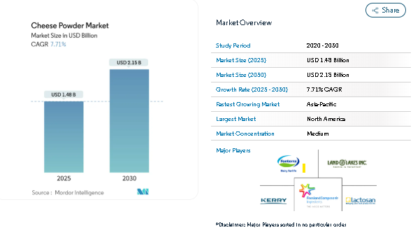 The global cheese powder market, valued at approximately USD 1.48 billion in 2025, is projected to climb to USD 2.15 billion by 2030, according to a recent report by Mordor Intelligence. This steady growth, at a CAGR of 7.71%, comes on the back of expanding demand in convenience foods, increasing quick-service restaurant (QSR) penetration in emerging markets, and improvements in cheese processing technology.