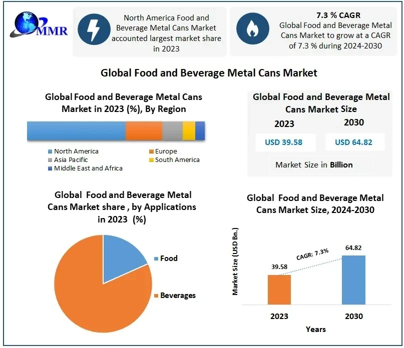 The global food and beverage metal cans market size was valued at USD 39.58 billion in 2023 and is expected to grow at a CAGR of 7.3% from 2024 to 2030, reaching a market size of approximately US$ 64.82 billion by 2030.