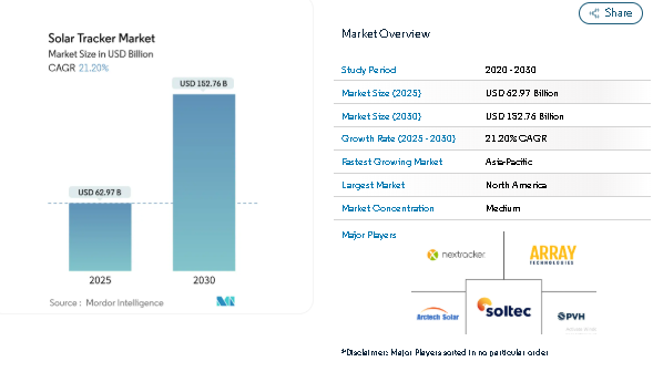 The solar tracker industry is poised for strong expansion over the next few years. The global solar tracker market, valued at USD 62.97 billion in 2025, is projected to reach USD 152.76 billion by 2030, registering a 21.2% CAGR. This growth is driven by rising demand for higher energy yield, supportive renewable-energy policies, and declining solar technology costs. Increasing adoption of tracker-equipped utility-scale projects further reinforces the market’s role as a critical component of global solar deployment.