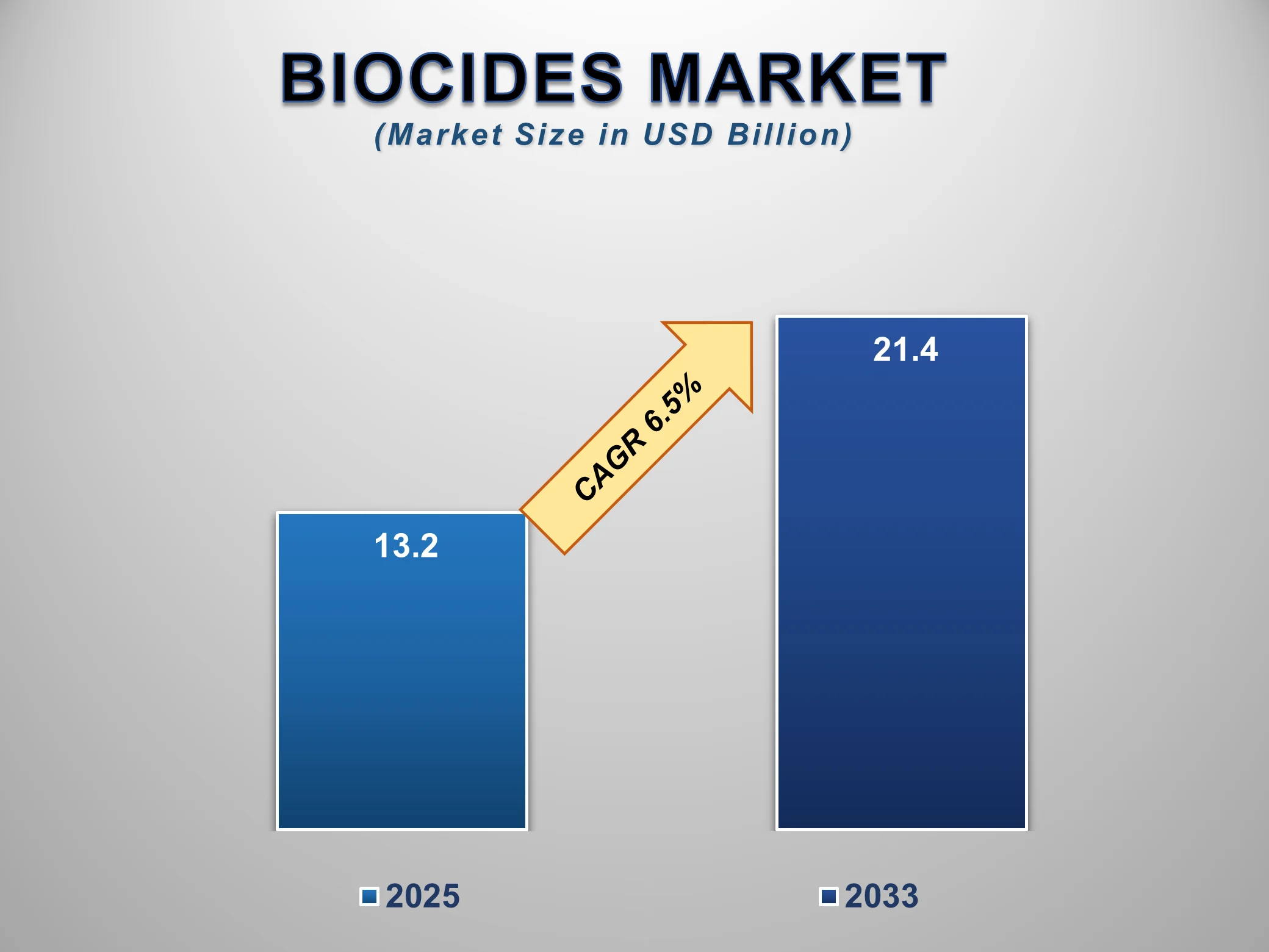 The Global Biocides Market is projected to grow from USD 13.2 billion in 2025 to USD 21.4 billion by 2033, registering a CAGR of 6.5% during the forecast period. This growth is driven by the rising need for antimicrobial and hygiene solutions across industrial, commercial, and municipal applications.