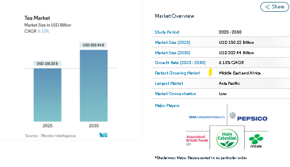 The global tea market continues to show steady progress, supported by rising awareness of tea’s wellness benefits, expanding premium categories, and higher adoption of online retail. According to forecast estimates, the market—valued at USD 150.32 billion in 2025—is expected to reach USD 202.44 billion by 2030, advancing at a 6.13% CAGR. This growth reflects the shift toward natural beverages, stronger demand for green and herbal teas, and broad acceptance of specialty tea formats across retail and foodservice sectors.