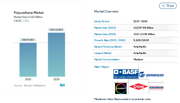 The global polyurethane industry is set for stable growth, driven by sustained demand from construction, automotive, furniture, electronics, and packaging applications. The polyurethane market is estimated at USD 87.48 billion in 2025 and projected to reach USD 113.84 billion by 2030, reflecting a 5.36% CAGR. This outlook is supported by the material’s strong insulation efficiency, cushioning performance, and versatility across both lightweight and high-strength end-use requirements.