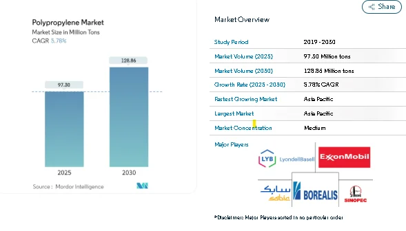 The global polypropylene market is set for steady expansion, driven by rising use across packaging, automotive, consumer goods, and electrical applications. In 2025, the market is valued at 97.30 million tons and is forecast to reach 128.86 million tons by 2030, reflecting a 5.78% CAGR.