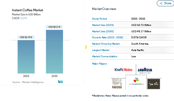 The instant coffee market continues to show steady growth as consumers increasingly seek convenient, consistent, and easy-to-prepare coffee options. According to industry assessments, the market is valued at USD 36.73 billion in 2025 and is projected to touch USD 48.17 billion by 2030, growing at a 5.57% CAGR. This upward trend is supported by strong demand from busy urban consumers, expanding café culture in developing regions, and a surge in premium instant coffee offerings that deliver better aroma and taste compared to traditional variants.