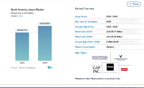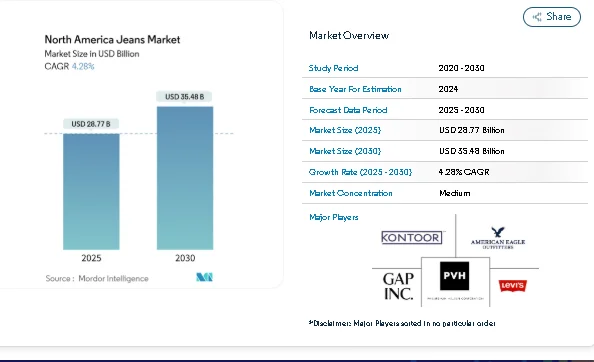 The North America jeans market continues to be one of the most resilient fashion categories, supported by long-established denim culture, growing preference for casual dressing, and rising interest in sustainable wardrobe choices. The market is valued at USD 28.77 billion in 2025 and is expected to reach USD 35.48 billion by 2030, recording a 4.28% CAGR.