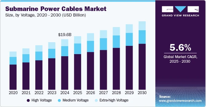 The global submarine cables market was valued at USD 31.70 billion in 2024 and is anticipated to reach USD 44.33 billion by 2030, growing at a CAGR of 5.6% from 2025 to 2030. This growth is primarily driven by increasing investments in offshore wind farms and the rising demand for data traffic, particularly from over-the-top (OTT) service providers.