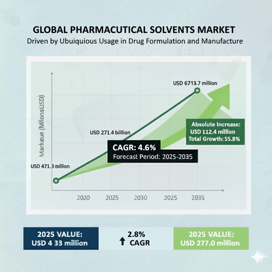 The FMI report, “Pharmaceutical Solvents Market Size, Share, and Forecast 2025–2035,” reveals an incremental USD 2.4 billion opportunity over the decade, propelled by rising demand for high-purity solvents in API synthesis, injectable formulations, and eco-friendly manufacturing processes.