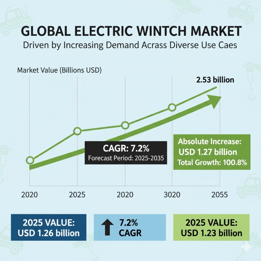 The global electric winch market is poised for robust expansion through 2035, driven by rising demand in recreational vehicles, marine electrification, and smart manufacturing. According to Future Market Insights (FMI), the market is valued at USD 1.26 billion in 2025 and is projected to hit USD 2.53 billion by 2035, growing at a compound annual growth rate (CAGR) of 7.2%.