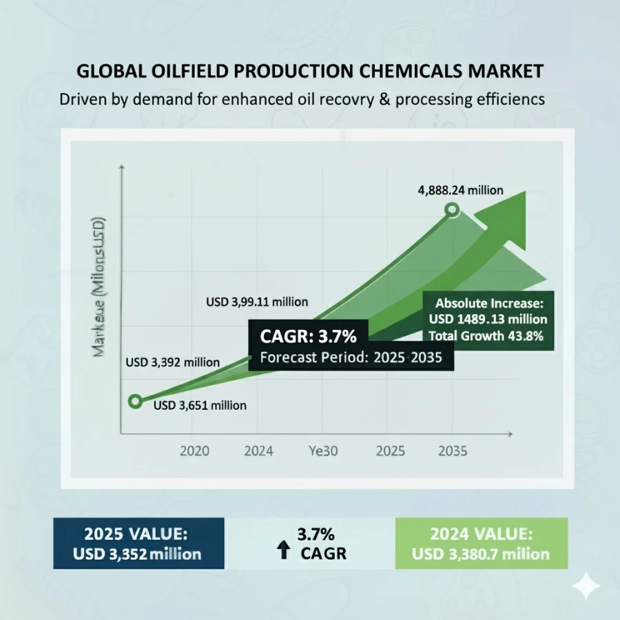 The global oilfield production chemicals market is poised for consistent growth through 2035, fueled by intensified upstream activities, enhanced oil recovery (EOR) techniques, and the shift toward eco-friendly formulations. According to Future Market Insights (FMI), the market is valued at USD 3,399.11 million in 2025 and is projected to hit USD 4,888.24 million by 2035, advancing at a compound annual growth rate (CAGR) of 3.7%.