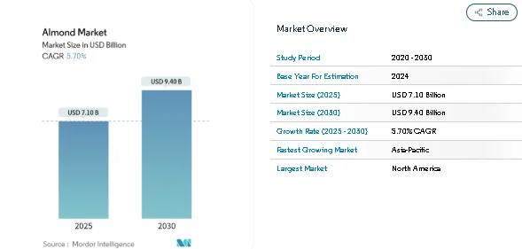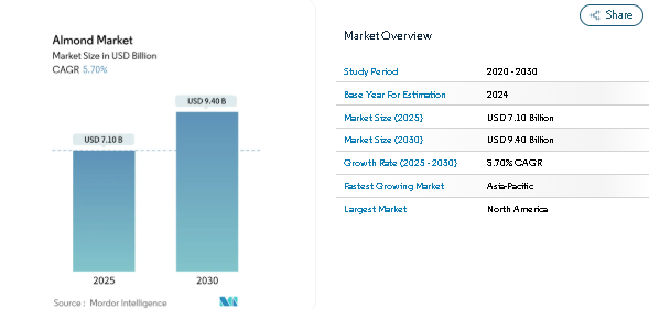 The global almond market continues to gain momentum as consumers adopt healthier eating habits and shift toward nutrient-rich foods. According to industry estimates, the market is expected to grow from USD 7.1 billion in 2025 to USD 9.4 billion by 2030, expanding at a CAGR of 5.70% during the forecast period. This steady growth is anchored in expanding almond consumption across snacks, plant-based dairy, bakery, confectionery, and specialty ingredient categories.